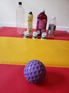 6) Gather a selection of empty bottles, line them up in a row (just like a row of Skittles), find an object to roll and see how many you can knock over!