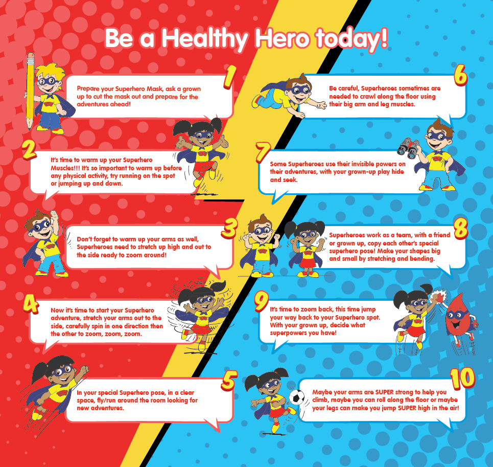 We will be handing out mask templates in class, or if you’re eager to get started you can download one here. Children can colour in and decorate their mask to match their unique superhero theme ready to wear to class during Healthy Heroes Week. Please supervise little ones and we look forward to seeing all their creations!