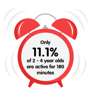 Guidance from the Chief Medical Officers in the UK states that children under the age of 5 years should be physically active for at least 180 minutes (3 hours) every day. But according to recent studies, only 11.1% of 2-4 year olds are achieving this.*