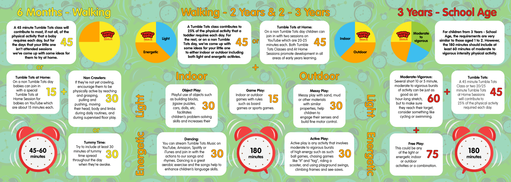 A Tumble Tots class contributes 45 minutes to a child’s daily recommended amount of physical activity, which equates to 25%. But even after classes, children still need to be active for an additional 2 hours and 15 minutes and on days when little ones don’t attend classes, 3 hours can seem like a lot to achieve.
